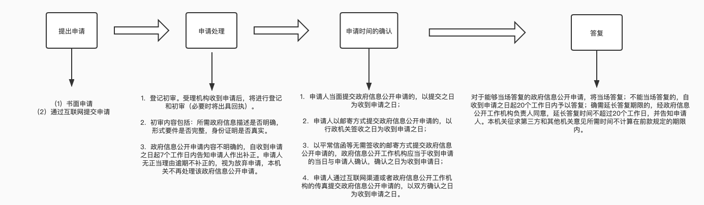 登記初審。行政機關收到申請后,將進行登記和初審(必要時將出具回執(zhí))。初審內(nèi)容包括:所需政府信息描述是否明確,形式要件是否完整,身份證明是否真實。