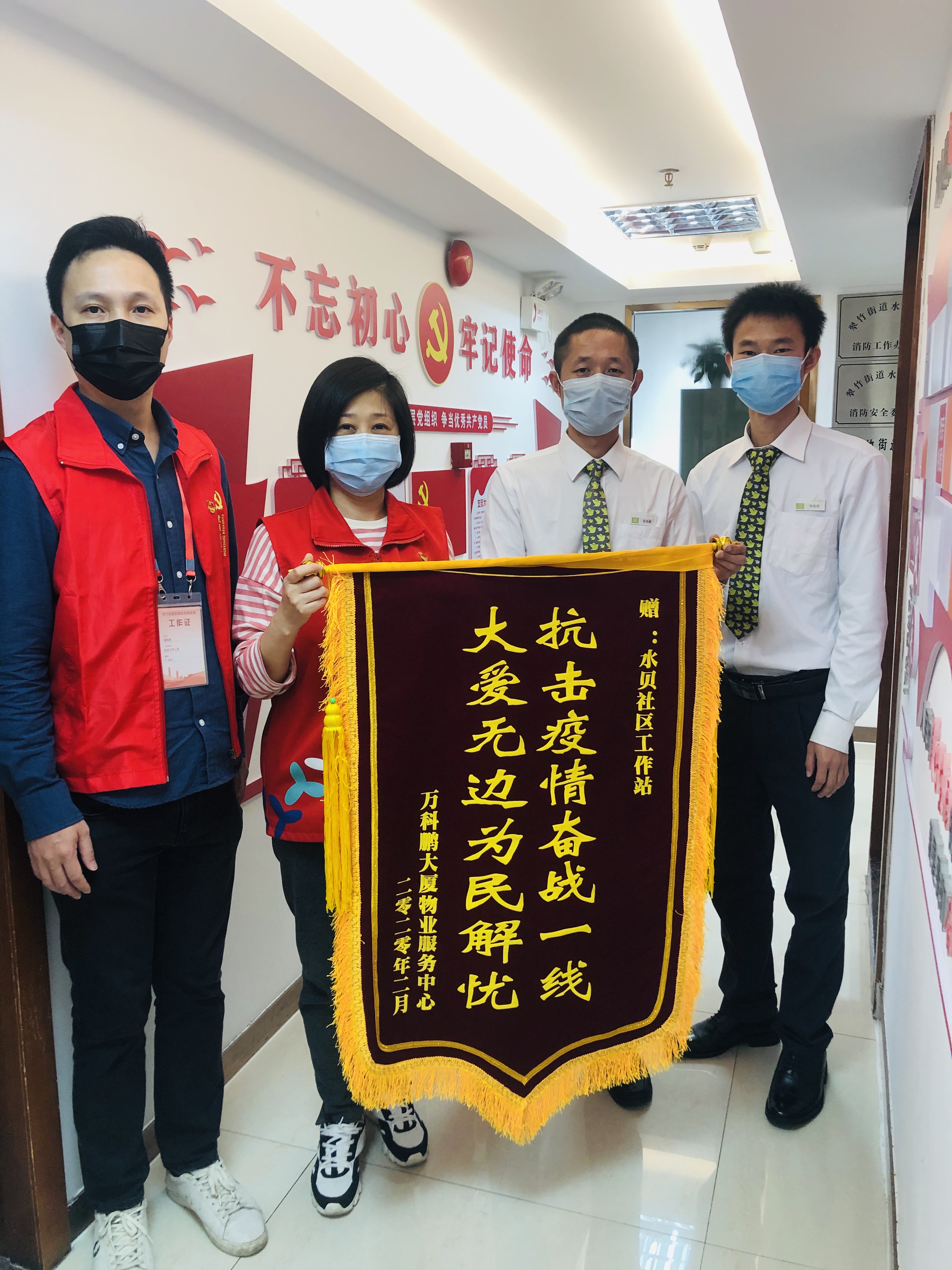 水貝社區(qū)萬(wàn)科鵬大廈為水貝社區(qū)工作站送來(lái)錦旗,萬(wàn)科鵬大廈物業(yè)在此次疫情防控中總體表現(xiàn)良好,業(yè)主普遍表示滿意感謝社區(qū)工作站在疫情防控期間對(duì)物業(yè)提供的幫助和指導(dǎo),不分晝夜共同參與一線防控,并協(xié)助提供許多防疫物資及人文關(guān)懷。