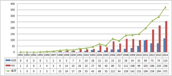 圖1 1992-2014年深圳市羅湖區(qū)歷年艾滋病報告數(shù)