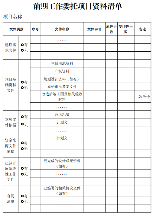 填寫須知: | 1、本資料清單僅作為資料交接,正式移交時(shí)間以簽訂《項(xiàng)目移交協(xié)議書》時(shí)間為準(zhǔn)。 2、本資料清單可根據(jù)項(xiàng)目性質(zhì)進(jìn)行調(diào)整。 | ||||||||||